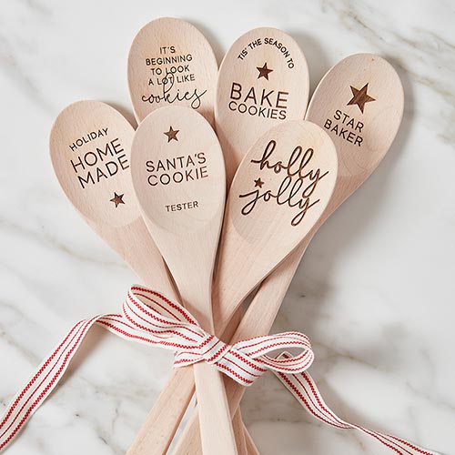 Mix up festive holiday treats with jolly wooden baking spoons! Each spoon has a unique holiday phrase that'll bring joy to any baker. Tie one to a cookie tin for a cheerful gift! Comes in a cloth bag for safekeeping when they're not in use. Ho ho ho!